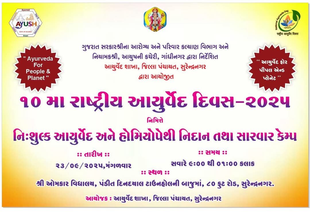 હિન્દ ન્યુઝ, સુરેન્દ્રનગર આયુષ મંત્રાલય દ્વારા આયોજિત ‘૧૦માં રાષ્ટ્રીય આયુર્વેદ દિવસ’ની ઉજવણીના ભાગરૂપે, સુરેન્દ્રનગર જિલ્લામાં એક વિશેષ નિ:શુલ્ક નિદાન અને સારવાર કેમ્પનું આયોજન કરવામાં આવ્યું છે. આ કેમ્પ, તા. ૨૩ સપ્ટેમ્બરના રોજ શ્રી ઓમકાર વિદ્યાલય, પંડિત દીનદયાળ ટાઉન હોલની બાજુમાં, ૮૦ ફૂટ રોડ, સુરેન્દ્રનગર ખાતે યોજાશે. કેમ્પનો સમય સવારે ૮ થી બપોરે ૧ કલાક સુધીનો રહેશે. આ કેમ્પમાં નિષ્ણાત ડોક્ટરો દ્વારા પાચન, શ્વાસન, ચામડી અને અન્ય રોગોની મફત સારવાર આપવામાં આવશે.