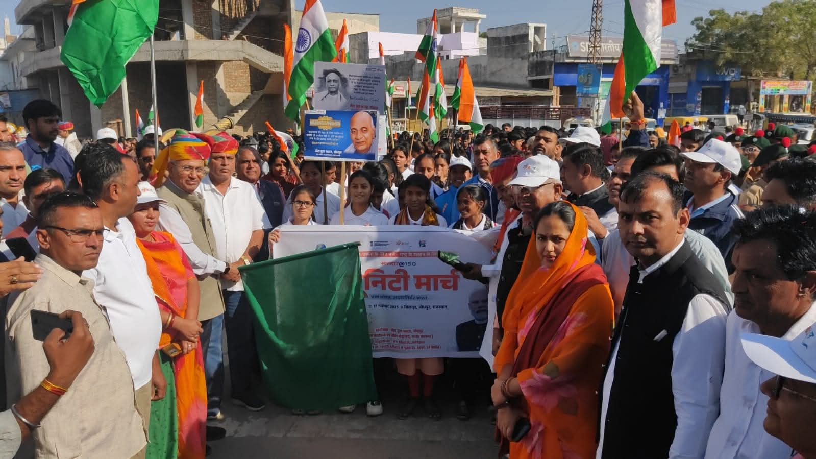 हिन्द न्यूज़, जोधपुर भाजपा जोधपुर देहात दक्षिण द्वारा आज सरदार वल्लभभाई पटेल जी की 150वीं जयंती के अवसर पर ‘सरदार 150 यूनिटी मार्च’ पद यात्रा का आयोजन जिला अध्यक्ष त्रिभुवन सिंह भाटी के नेतृत्व में बिलाड़ा शहर के तिरंगा सर्किल से सीरवी मोतीसिंह स्टेडियम तक किया गया। इस दौरान पाली लोकसभा सांसद श्री पीपी चौधरी, बिलाड़ा विधायक अर्जुनलाल गर्ग, जिला उपाध्यक्ष जयकिशन पंचारिया, जिला महामंत्री डॉ. यशपाल गोधा, श्रीमती सुमित्रा विश्नोई, बिलाड़ा प्रधान श्रीमती प्रगति कुमारी खेजड़ला, बिलाड़ा नगरपालिका अध्यक्ष श्री रूपसिंह सीरवी, जिला…