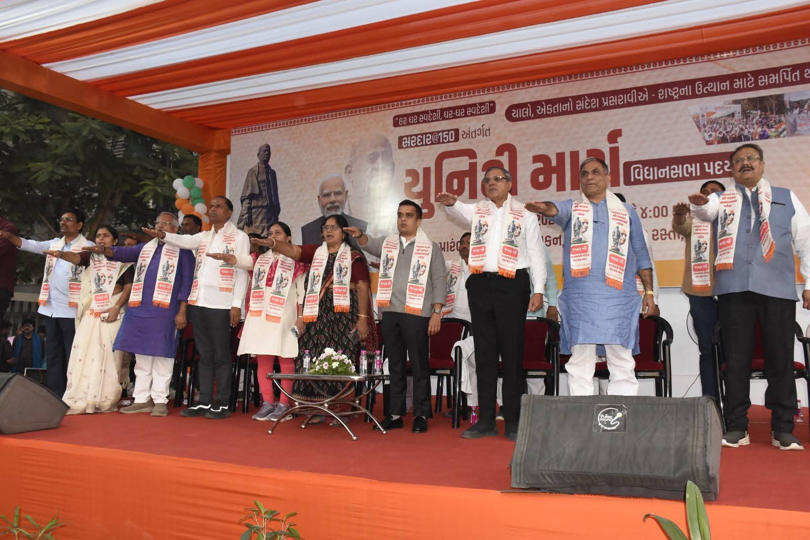 હિન્દ ન્યુઝ, ગાંધીનગર નાયબ મુખ્યમંત્રી હર્ષ સંઘવીએ સરદાર વલ્લભભાઈ પટેલની 150મી જન્મજયંતિ નિમિત્તે ગાંધીનગર દક્ષિણ વિધાનસભા વિસ્તારના શ્યામ શુકન–પી.ડી.પી.યુ ચાર રસ્તાથી ‘સરદાર @150 યુનિટી માર્ચ’ નું ફ્લેગઓફ કરાવ્યું હતું. આ અવસરે સ્વદેશી વસ્તુઓના ઉપયોગ સાથે આત્મનિર્ભર ભારતના નિર્માણનો સામૂહિક સંકલ્પ લેવામાં આવ્યો હતો. વડાપ્રધાન નરેન્દ્રભાઈ મોદીની પ્રેરણાથી દેશવ્યાપી રીતે યોજાતી આ યુનિટી માર્ચનો હેતુ રાષ્ટ્રીય એકતા અને અખંડિતતાનો સંદેશ ઘરે ઘરે પહોંચાડવાનો છે. ‘આત્મનિર્ભર ભારત’ તથા ‘એક ભારત શ્રેષ્ઠ ભારત’ની થીમ સાથે યોજાયેલી પદયાત્રામાં નાયબ મુખ્યમંત્રીએ હાજર વિશાળ જનસમુદાયને સંબોધતા જણાવ્યું કે આ પદયાત્રા રાષ્ટ્રીય…