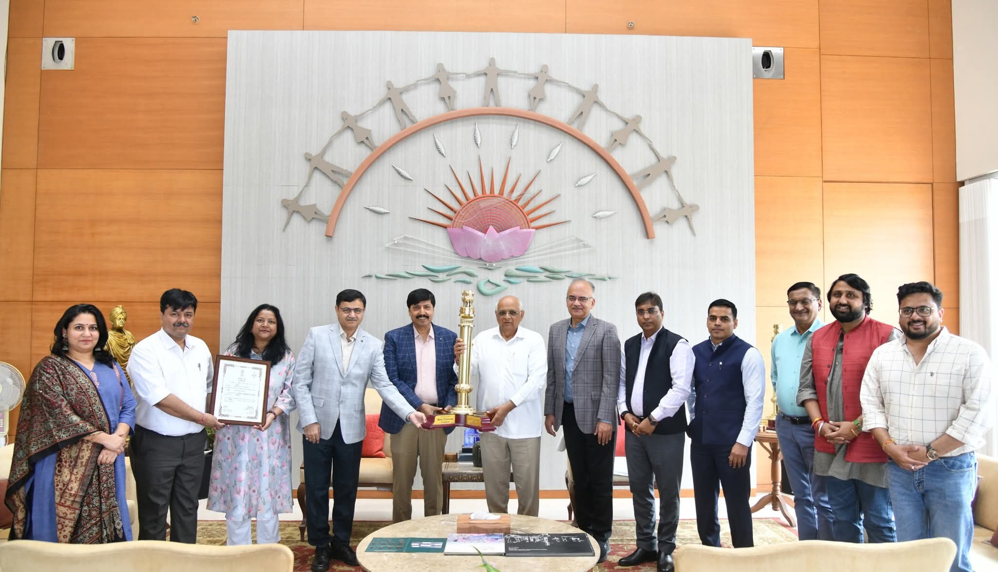 હિન્દ ન્યુઝ, ગાંધીનગર 77મા પ્રજાસત્તાક પર્વની રાષ્ટ્રીય પરેડમાં ‘સ્વતંત્રતા કા મંત્ર : વંદે માતરમ્’ થીમ આધારિત ગુજરાતના ટેબ્લોને મળેલ સન્માન ટ્રોફી અને પ્રશંસાપત્રને મુખ્યમંત્રી ભૂપેન્દ્રભાઈ પટેલને અર્પણ કરવામાં આવ્યા. માહિતી અને પ્રસારણ સચિવ ડૉ. વિક્રાંત પાંડે અને માહિતી કમિશનર કિશોર બચાણી દ્વારા વિજેતા ટ્રોફી અને પ્રશંસાપત્ર અર્પણ કરવામાં આવ્યા. આ પ્રસંગે મુખ્ય સચિવ એમ. કે. દાસ, મુખ્યમંત્રી કાર્યાલયના અગ્ર સચિવ સંજીવકુમાર તથા માહિતી કમિશનર કચેરીના ઉચ્ચ અધિકારીઓ ઉપસ્થિત રહ્યાં