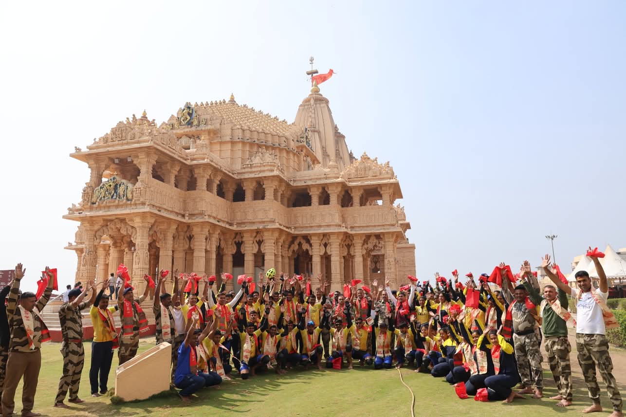 હિન્દ ન્યુઝ, સોમનાથ “વંદે માતરમ્” ગાનના ૧૫૦ વર્ષની સ્મૃતિમાં કેન્દ્રીય ઔદ્યોગિક સુરક્ષા બળ (CISF) દ્વારા આયોજીત રાષ્ટ્રીય સ્તરની કોસ્ટલ સાયક્લોથોનના સાઈકલિસ્ટ્સ આજે સવારે સોમનાથ ખાતે આવી પહોંચ્યા હતાં. રાષ્ટ્રીય સુરક્ષા અને જનજાગૃતિનો સંદેશ લઈ ગીર સોમનાથ પહોંચેલા તમામ સાઈકલિસ્ટ્સોએ પ્રથમ જ્યોતિર્લિંગના દર્શન કર્યા હતાં. માધવપુર બીચ થઈને ગીર સોમનાથ જિલ્લામાં પ્રવેશ કરતાં જ ડારી ટોલનાકા પાસે એન.જે.સોનેચા મેનેજમેન્ટ ઈન્સ્ટીટ્યૂટ ખાતે સાઈકલ રેલીના તમામ સાઈકલિસ્ટ્સનું વિદ્યાર્થીનીઓએ કુમકુમ-તિલકથી ઉષ્માસભર સ્વાગત કર્યું હતું. અહીં ટૂંકાગાળાના રોકાણ બાદ સાઈકલ રેલી સોમનાથ પહોંચી હતી.