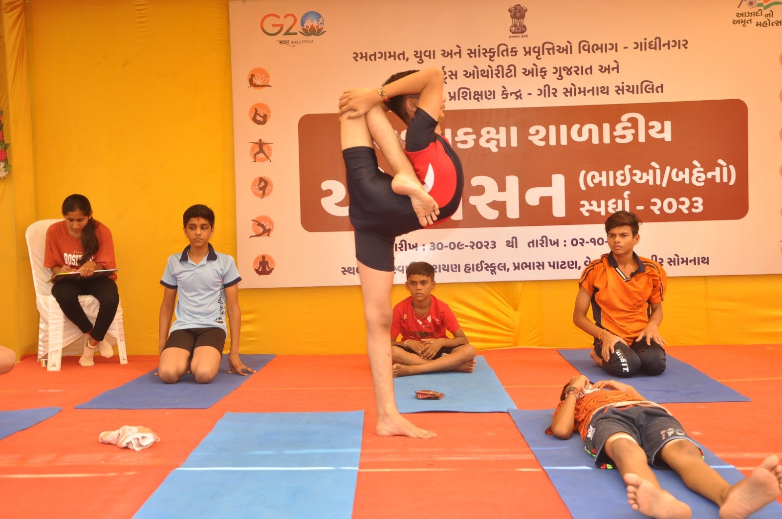 ગુજરાત સરકાર ના, રમતગમત,યુવા અને સાંસ્કૃતિક પ્રવૃત્તિઓ વિભાગ, ગાંધીનગર અને સ્પોર્ટ્સ ઓથોરીટી ઓફ ગુજરાત, ગાંધીનગર આયોજીત અને જિલ્લા રમતગમત અધિકારી, ગીર સોમનાથ દ્વારા સંચાલિત શાળાકીય રમતોત્સવ-૨૦૨૩ અંતર્ગત રાજયકક્ષા યોગાસન અન્ડર-૧૭ (ભાઇઓ/ બહેનો)ની સ્પર્ધા તા. ૩૦ સપ્ટેમ્બરથી તા.૦૨ ઓક્ટોબર સુધી સ્વામીનારાયણ ગુરૂકુળ હાઇસ્કુલ, શંખ સર્કલ, પ્રભાસ પાટણ, સોમનાથ ખાતે યોજાઈ હતી.