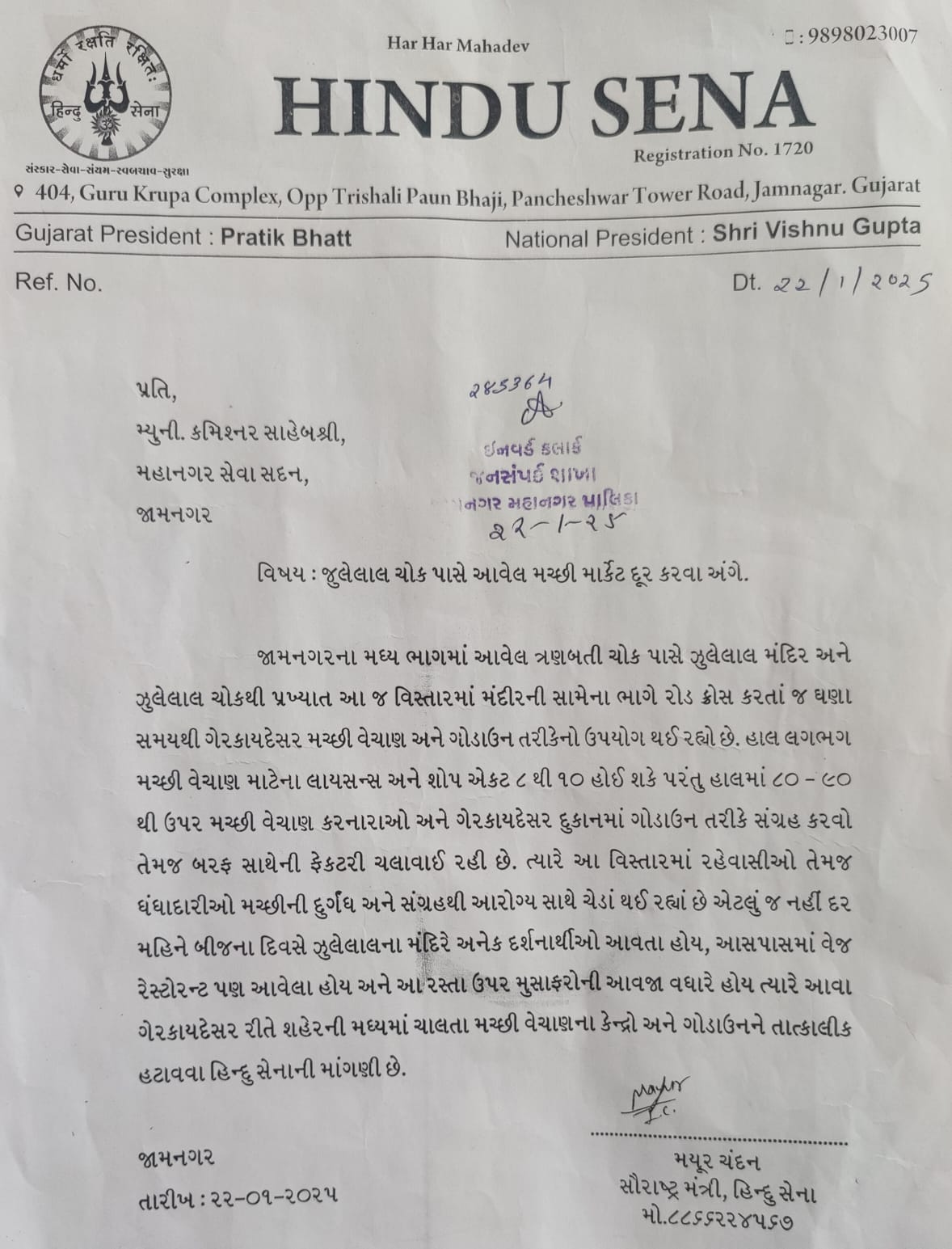 એટલું જ નહીં દર મહિને બીજના દિવસે ઝુલેલાલના મંદિરે અનેક દર્શનાર્થીઓ આવતા હોય આસપાસમાં વેજ રેસ્ટોરન્ટ પણ આવેલ હોય અને આ રસ્તા ઉપર મુસાફરોની આવજા વધારે હોય ત્યારે આવા ગેરકાયદેસર રીતે શહેરની મધ્યમાં ચાલતા મચ્છી વેચાણના કેન્દ્રો અને ગોડાઉનને તાત્કાલિક હટાવવા હિન્દુ સેના દ્વારા જામનગરના મા. મ્યુનિ. કમિશનર પાસે રજૂઆત સાથે માંગણી જાન્યુઆરી 2025માં કરી હતી.