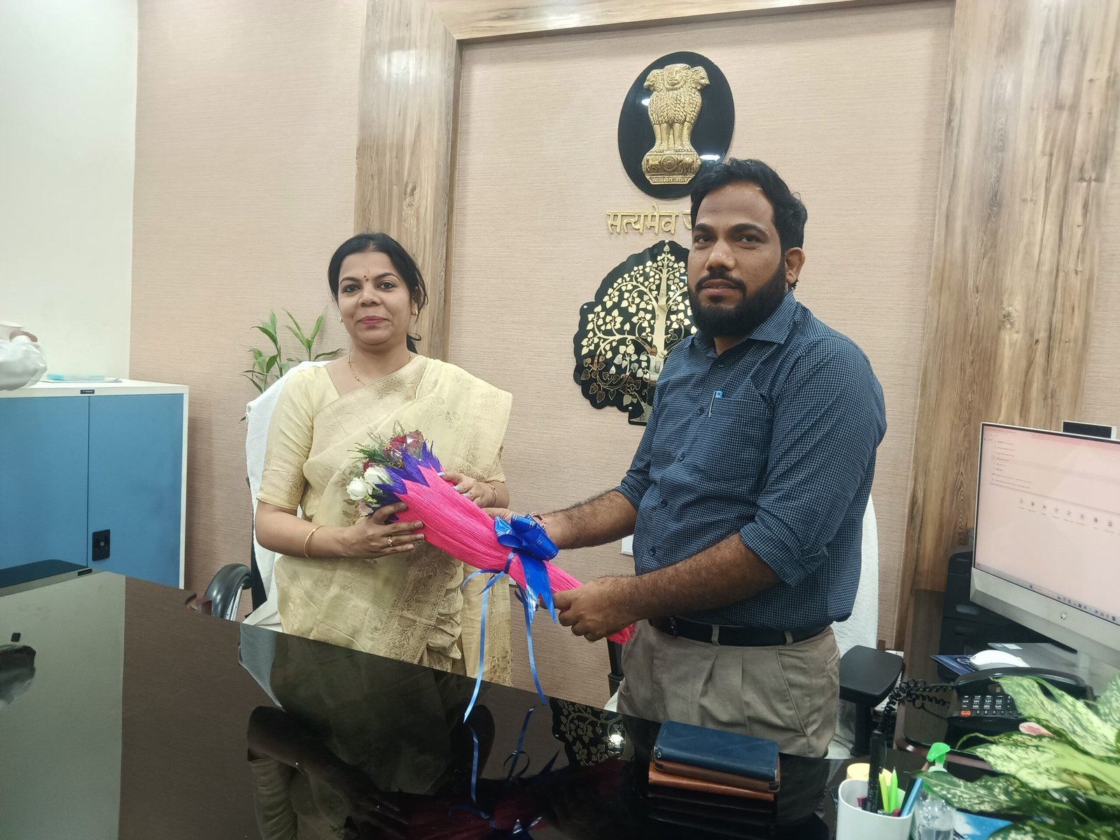 निवर्तमान जिला पदाधिकारी यशपाल सिंह मीणा ने जिला पदाधिकारी श्री वर्षा सिंह को पुष्प गुच्छ देखकर स्वागत किया।