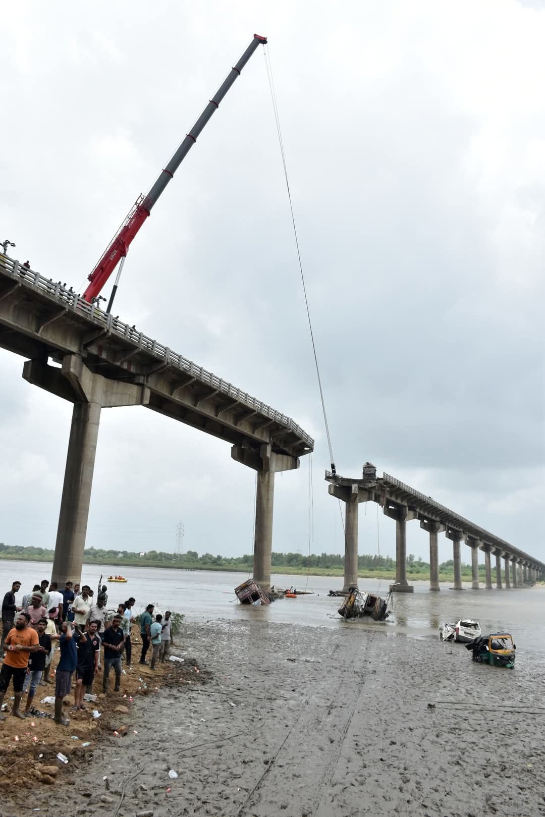 ૦ મહી નદીની અંદર ફસાયેલા વાહનોને કાઢવામાં crain ઉપરાંત સેનાના હાઈ પરફોર્મન્સ ટ્રક પાછળ વાયરો બાંધી ખેંચવામાં આવ્યા હતા. કીચડમાં ખૂચેલા અને લોડેડ ટ્રકને ખેંચવા જતા એક વખત વાયર પણ તૂટી ગયો હતો.