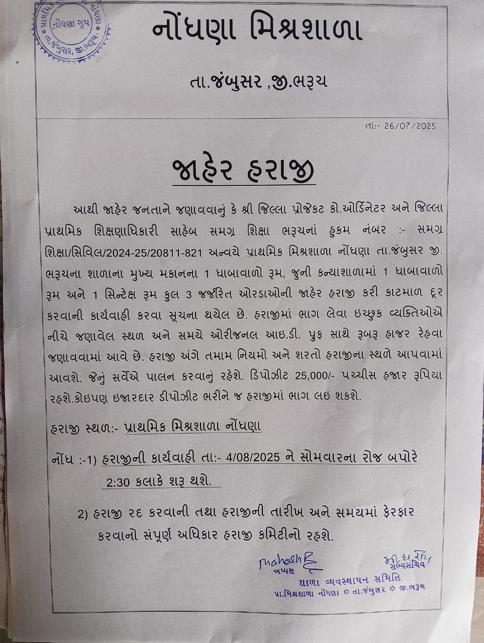 આથી જાહેર જનતાને જણાવવાનું કે, શ્રી જિલ્લા પ્રોજેક્ટ કો-ઓર્ડીનેટર અને જિલ્લા પ્રાથમિક શિક્ષણાધિકારી સાહેબ સમગ્ર સિક્ષા ભરૂચ ના હુકમ શિક્ષા સિવિલ /2024 -25/200811-821 અન્વયે પ્રાથમિક મિશ્ર શાળા નોંધણા તા જંબુસર જી ભરૂચ ના શાળાના મુખ્ય મકાનના 1 ધાબા વાળો રૂમ જૂની કન્યાશાળામાં એક ધાબા વાળો રૂમ અને 1 સિન્ટેક્ષ રૂમ કુલ 3 જજરીત ઓરડાઓની જાહેર હરાજી કરી કાટમાળ દુર કરવાની કાર્યવાહી કરવા સૂચના થયેલ છે હરાજીમાં ભાગ લેવા ઈચ્છુક વ્યક્તિઓએ નીચે જણાવેલ સ્થળ અને સમયે ઓરીજનલ આઈડી પ્રૂફ સાથે રૂબરૂ હાજર રહેવા જણાવવામાં આવે છે હરાજી અંગે તમામ નિયમો અને શરતો હરાજીના સ્થળે આપવામાં આવશે જેનું સર્વેએ પાલન કરવાનું રહેશે ડિપોઝિટ 25,000 હજાર રૂપિયા રહેશે કોઈપણ ઇજારદાર ડિપોઝિટ ભરીને હરાજીમાં ભાગ લઈ શકશે.