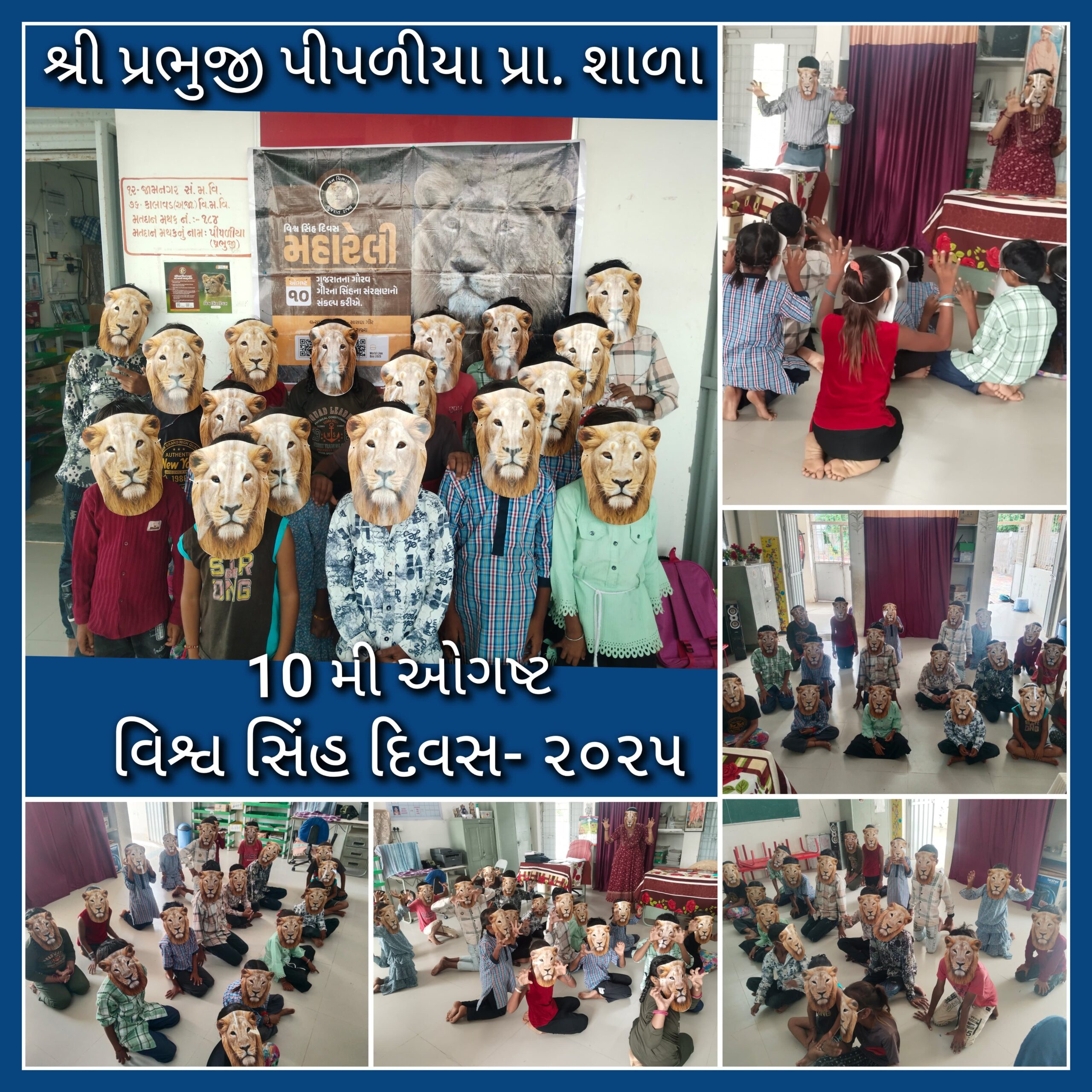 “વિશ્વ સિંહ દિવસ” નિમિત્તે શ્રી પ્રભુજી પીપળીયા પ્રાથમિક શાળાના બાળકો દ્વારા સિંહના માખોટા પહેરી સિંહોનું સંવર્ધન કરી, તેઓનું રક્ષણ અને જતન કરવા અંગે પ્રતિજ્ઞા લેતા બાળકો