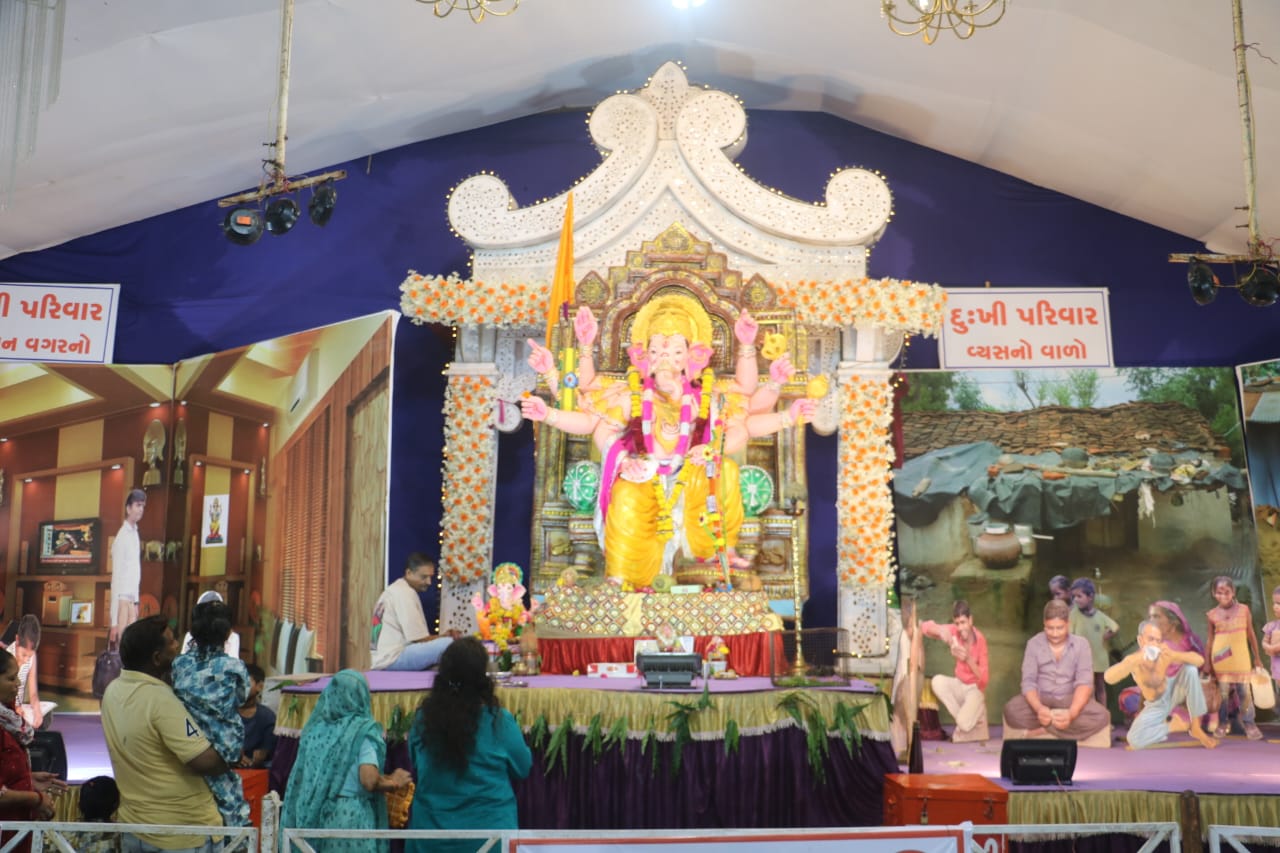 જેમાં એક ગણપતિ મૂર્તિ ઉપર સુખી પરિવાર વ્યસન વગરનો બતાવવામાં આવ્યો છે. જ્યારે બીજી મુર્તિની સાથે વ્યસન વાળો દુ:ખી પરિવાર દર્શાવવામાં આવ્યો છે. આમ વ્યસન મુક્તિના થીમ પર બનાવવામાં આવેલા આ પંડાલ લોકોનું આકર્ષણ જમાવ્યુ છે.