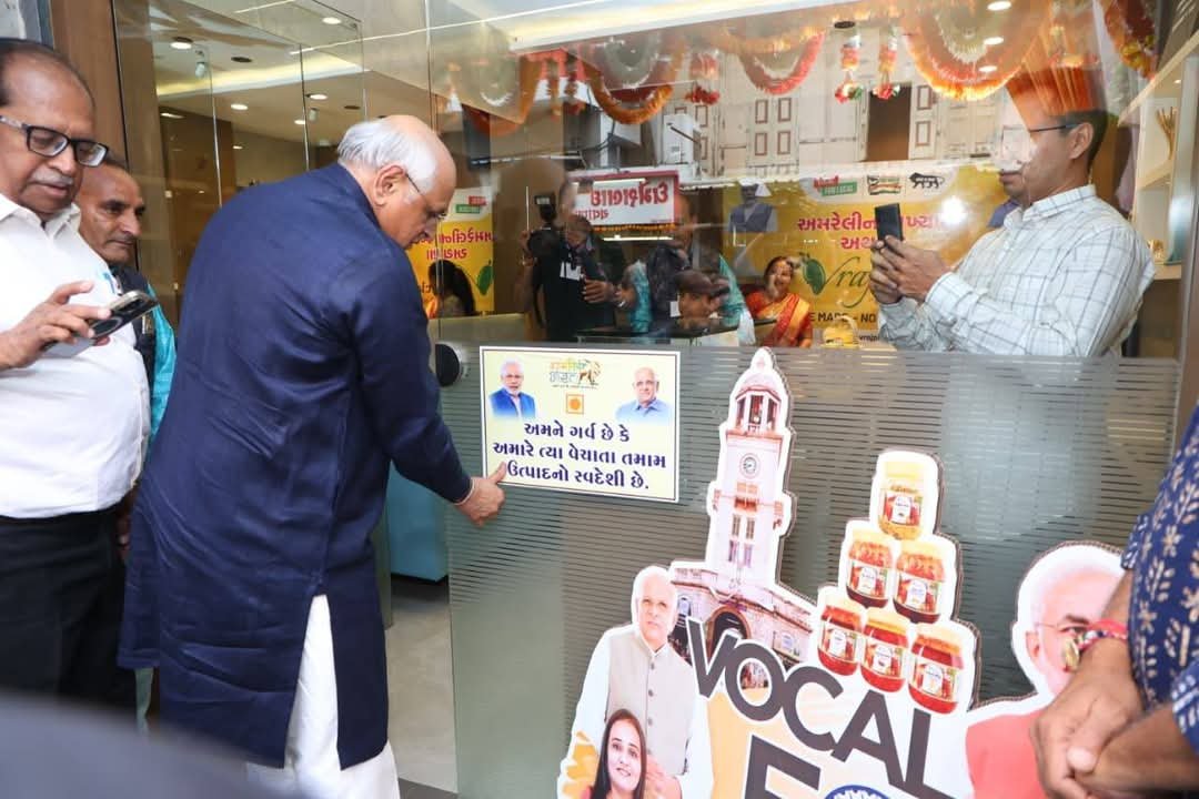મુખ્યમંત્રી શ્રી ભૂપેન્દ્રભાઈ પટેલે અમરેલીના ટાવર ચોક ખાતે આવેલી દુકાનોમાં પ્રતિકાત્મક સ્વદેશી ઉત્પાદનોના સ્ટીકર લગાવી ‘સ્વદેશી અભિયાન’ અંગે પ્રેરણાબળ પૂરું પાડ્યું હતું. મુખ્યમંત્રીશ્રીએ વેપારીઓ સાથે સહજભાવે સંવાદ સાધીને તેમના દ્વારા વેચાતાં ઉત્પાદનો વિશે જાણકારી મેળવી હતી.