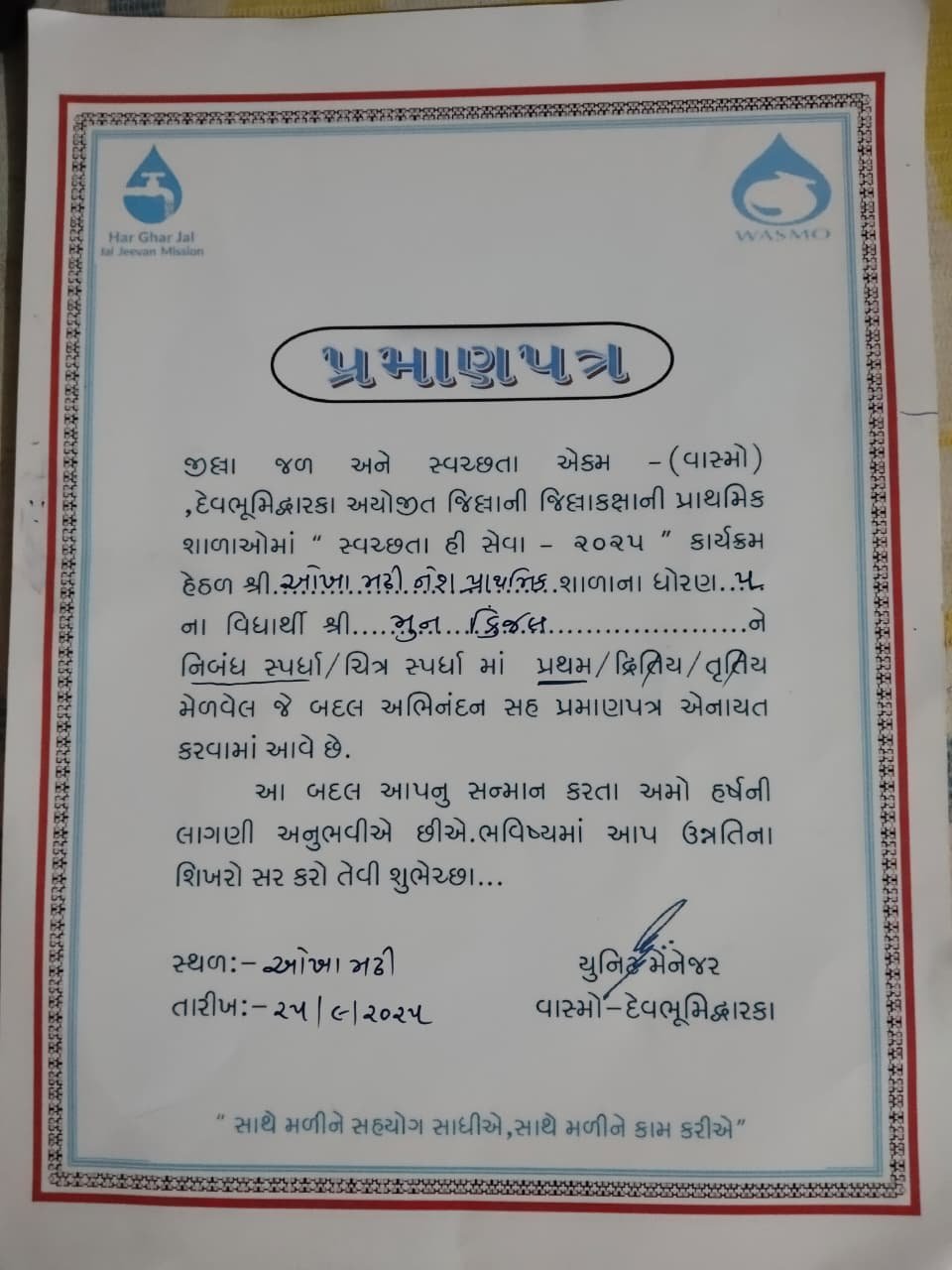 વિદ્યાર્થિનીને પ્રમાણપત્ર આપી સન્માનિત કરવામાં આવ્યા. આ અવસરે વાસ્મોના અધિકારીઓએ જણાવ્યું કે બાળકોમાં બાળપણથી જ સ્વચ્છતા અંગે જાગૃતિ લાવવી એ અભિયાનનું મુખ્ય ધ્યેય છે.