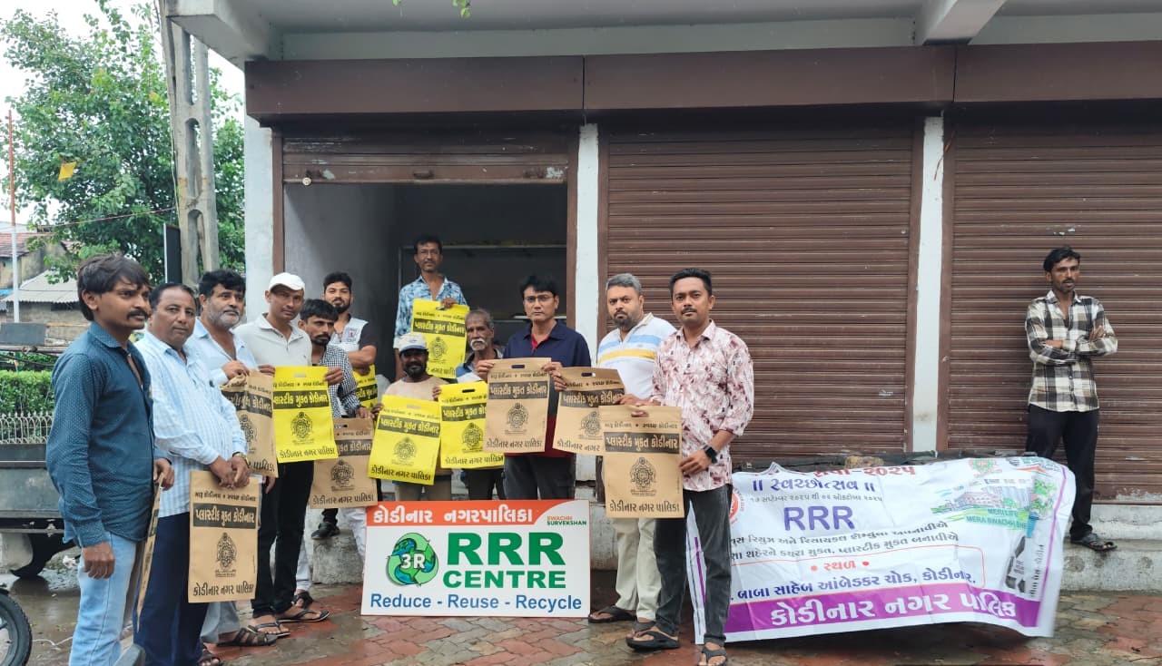 જે ઉપક્રમે કોડીનારના ‘રિડ્યૂઝ, રિસાયકલ, રિયૂઝ’ (આર.આર.આર) સેન્ટર ખાતે નાગરિકોને કાપડની થેલીનું વિતરણ કરવામાં આવ્યું હતું અને જ્યાં પણ ખરીદી માટે નાગરિકો જાય તો ત્યાં પ્લાસ્ટિકના ઝભલાના ઉપયોગના બદલે કાપડની થેલીનો વપરાશ કરે એવી અપીલ કરવામાં આવી હતી.
