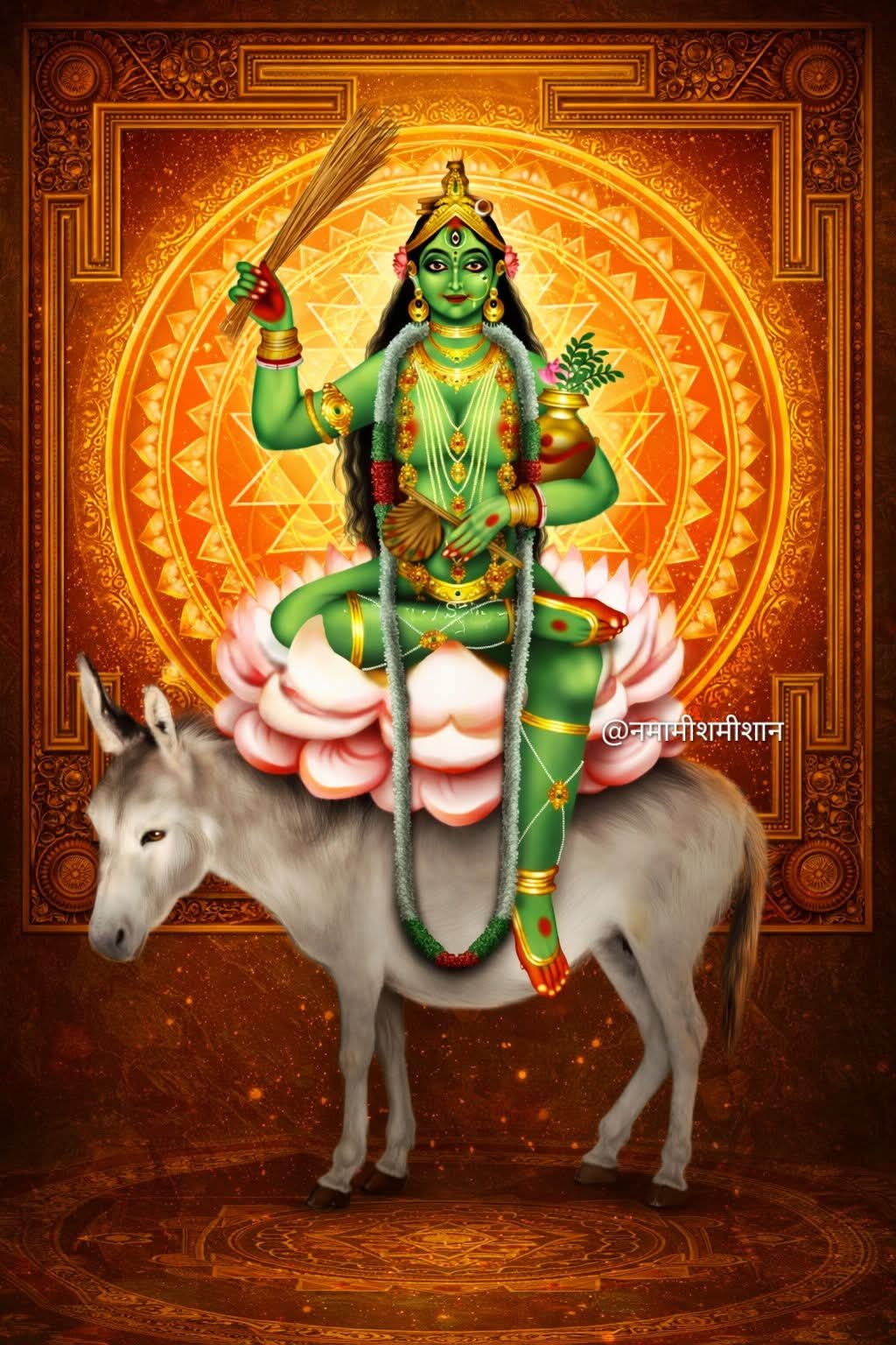 मैं उस देवी शीतला को प्रणाम करता हूँ जो गधे पर विराजमान हैं, हाथ में झाड़ू और कलश धारण करती हैं और जो सभी रोगों तथा भय को दूर करने वाली हैं। जिनकी शरण में जाने से बड़े से बड़ा रोग भी शांत हो जाता है।