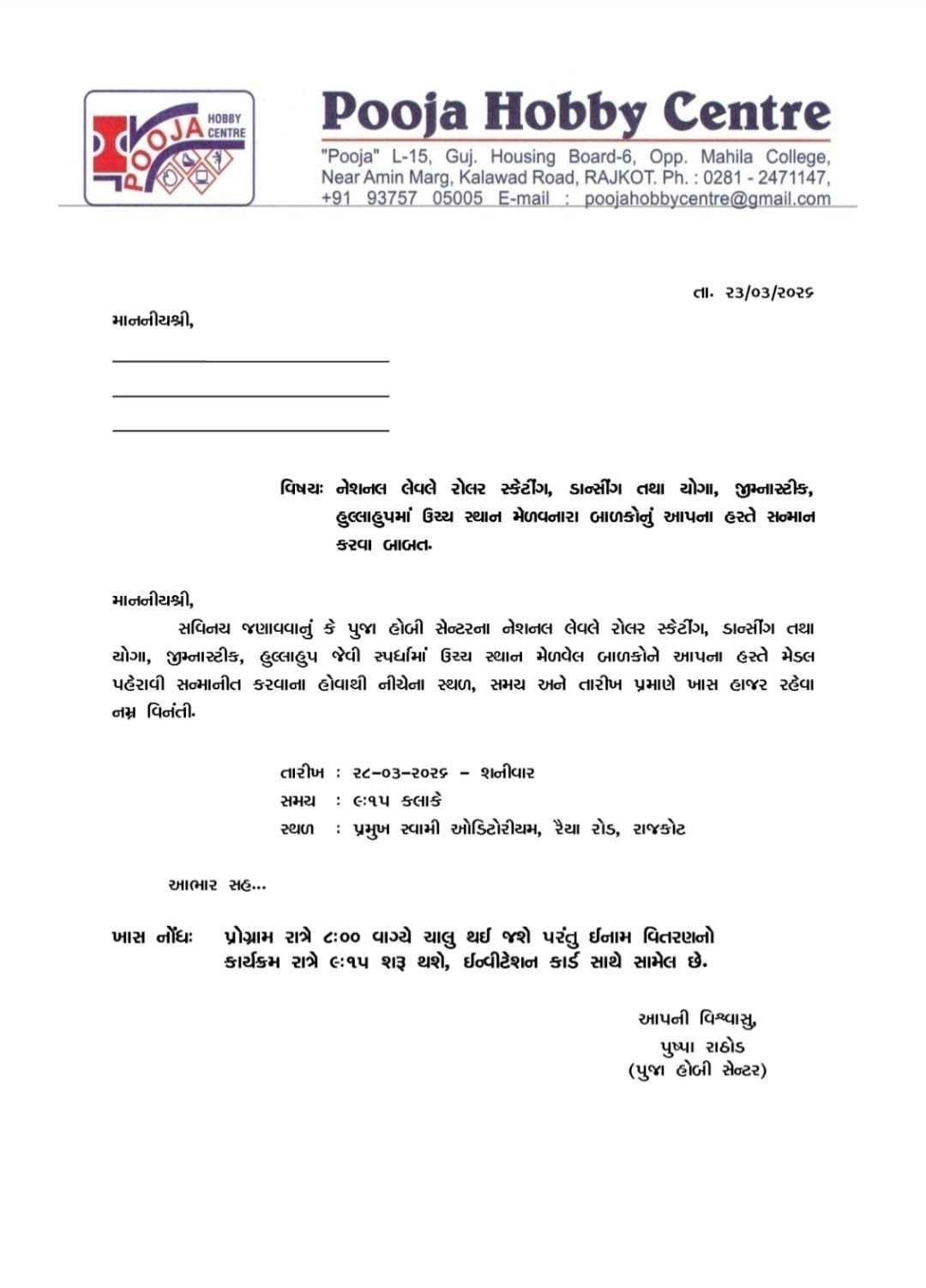 પુજા હોબી સેન્ટર અને પોદર પ્રેપ અક્ષર માર્ગ દ્વારા ૩૫મો વાર્ષિકોત્સવ દાદા-દાદી, નાના-નાની, માતા-પિતા, ટીચર તથા બેસ્ટ સ્ટુડન્ટનું સન્માન, બેન-ભાઈઓનું સન્માન તથા એક એક થી ચડિયાતી ૧૬ કૃતિઓ ૩૦૦ થી વધારે બાળકો દ્વારા પ્રસ્તુત
