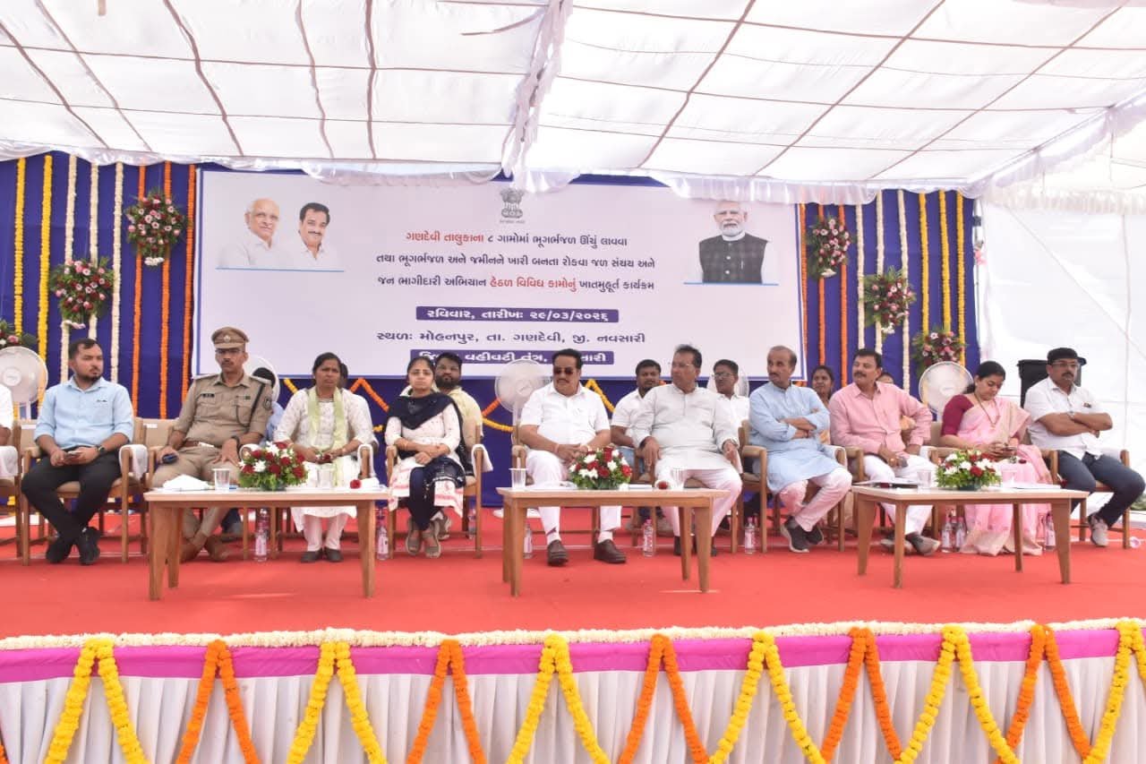 ગણદેવી તાલુકાના દરિયાકાંઠાના વિસ્તારોમાં ભૂગર્ભ જળના સ્તર ઊંચા લાવવા અને જમીનમાં વધતી જતી ખારાશને રોકવા માટે ‘જળ સંચય અને જન ભાગીદારી અભિયાન’ હેઠળ એક મહત્વકાંક્ષી પ્રોજેક્ટનો પ્રારંભ કરવામાં આવ્યો છે. રવિવાર, ૨૯ માર્ચ ૨૦૨૬ના રોજ મોહનપુર ખાતે કેન્દ્ર સરકારના જળશક્તિ મંત્રાલયના મંત્રી સી.આર. પાટીલના વરદ હસ્તે જળ સંચયને લગતા વિવિધ વિકાસ કામોનું ખાતમુહૂર્ત કરવામાં આવ્યું હતું.