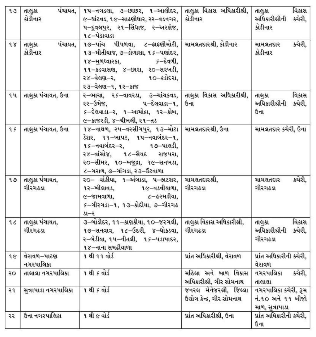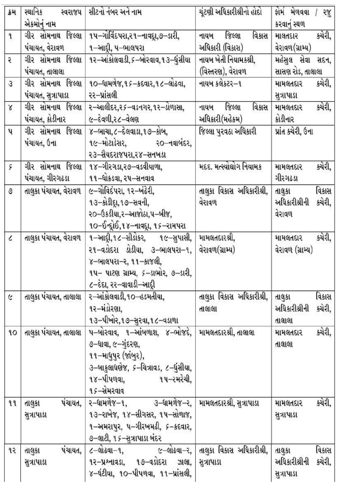 સ્થાનિક સ્વરાજ્ય એકમોનું નામ, સીટનો નંબર અને નામ, ચૂંટણી અધિકારીનો હોદ્દો અને ફોર્મ મેળવવા-રજૂ કરવા માટેના સ્થળની વિગતો નીચે મુજબ છે.